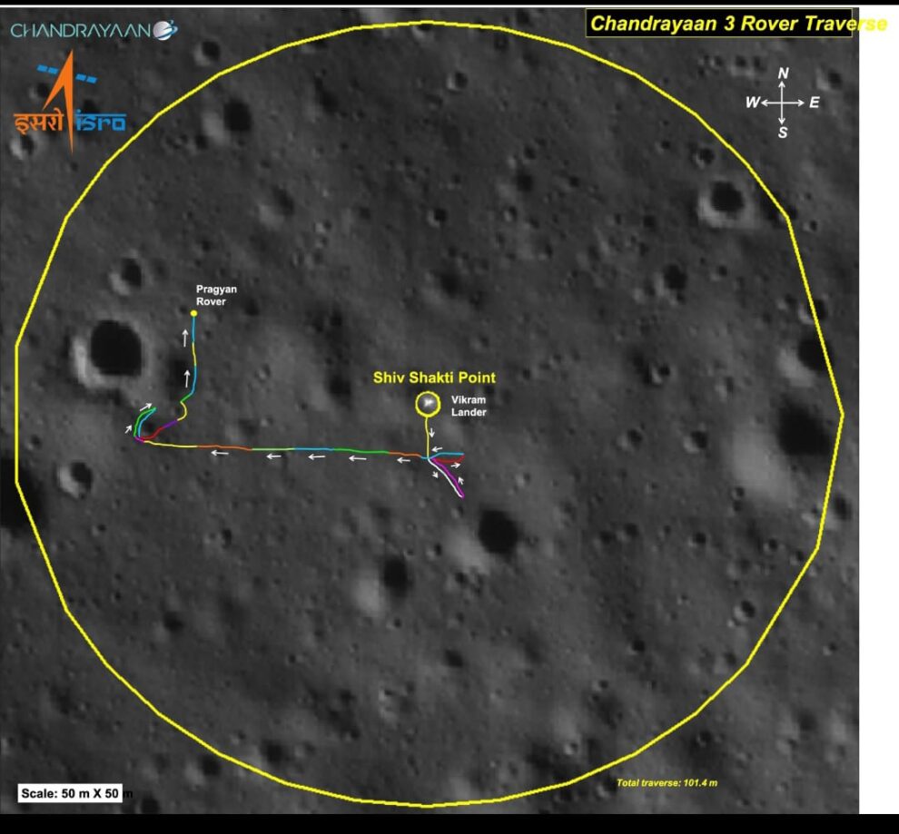 नई दिल्ली। आदित्य एल-1 के सफल प्रक्षेपण के बीच चंद्रयान-3 से भी एक अच्छी खबर है। चंद्रमा की सतह पर प्रज्ञान रोवर ने अबतक 100 मीटर की दूरी तय कर ली है। भारतीय अंतरिक्ष अनुसंधान संगठन (इसरो) ने प्रज्ञान रोवर के अबतक की चांद पर सैर का नक्शा जारी किया है।